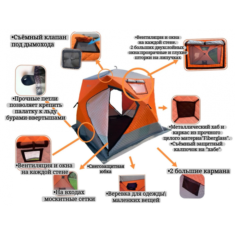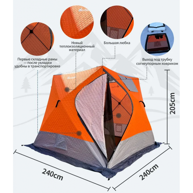 Зимняя палатка ТРЕХСЛОЙНАЯ для зимней рыбалки оранжевая MC-2017A куб 240*240*220см предназначена для создания комфортных условий во время зимнего туризма.